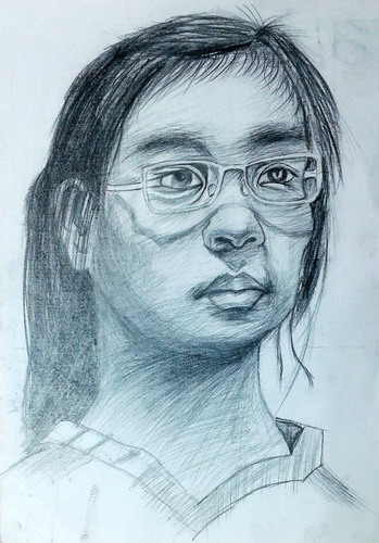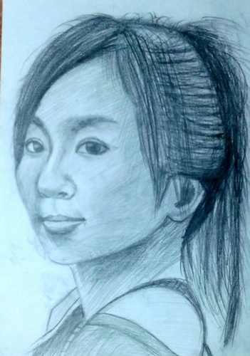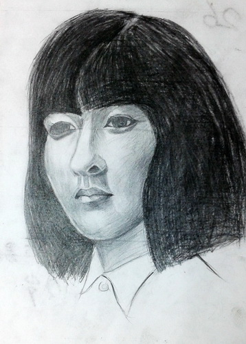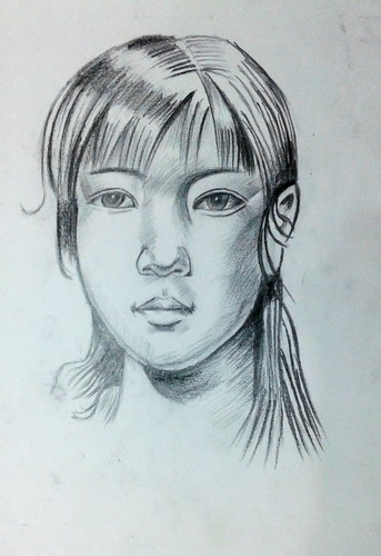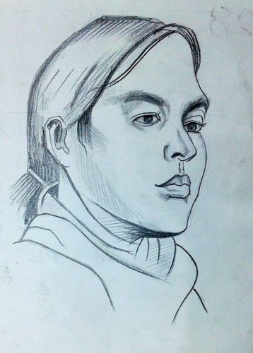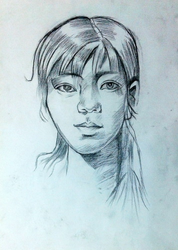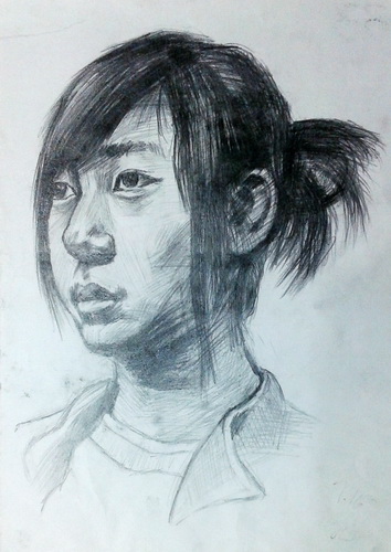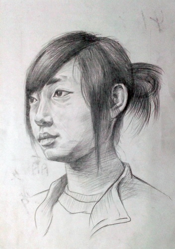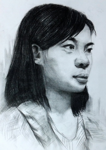 侧面女青年头像(炭笔画)