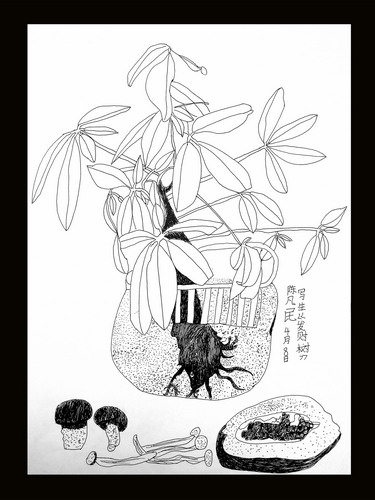 《发财树、木瓜、菌类组合写生》